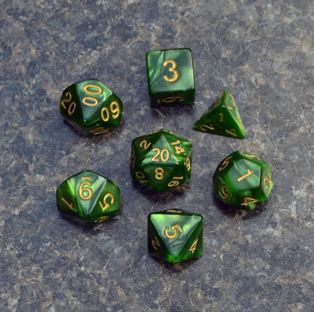 Marble green color with gold numbers (note: these dice are a bit lighter than the monitor may suggest)